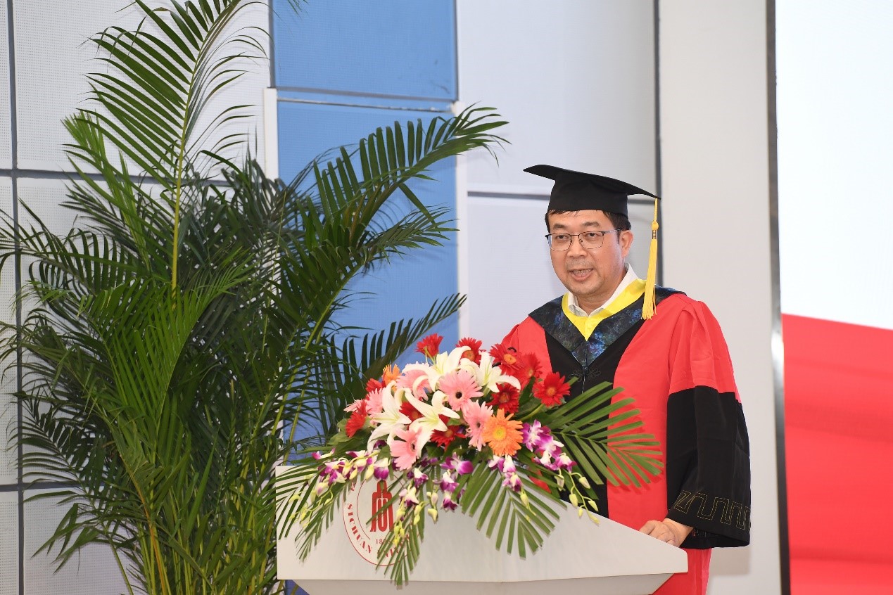 博士毕业生吴周杰同学作为研究生代表发言,他回顾了在川大9年的本硕博学习生涯,从开始对科研的恐惧到最后的喜欢,在科研中“做一名追光者,且不忘生活的浪漫”,短暂而又充实。最后,他祝愿学院蓬勃发展、再创辉煌。