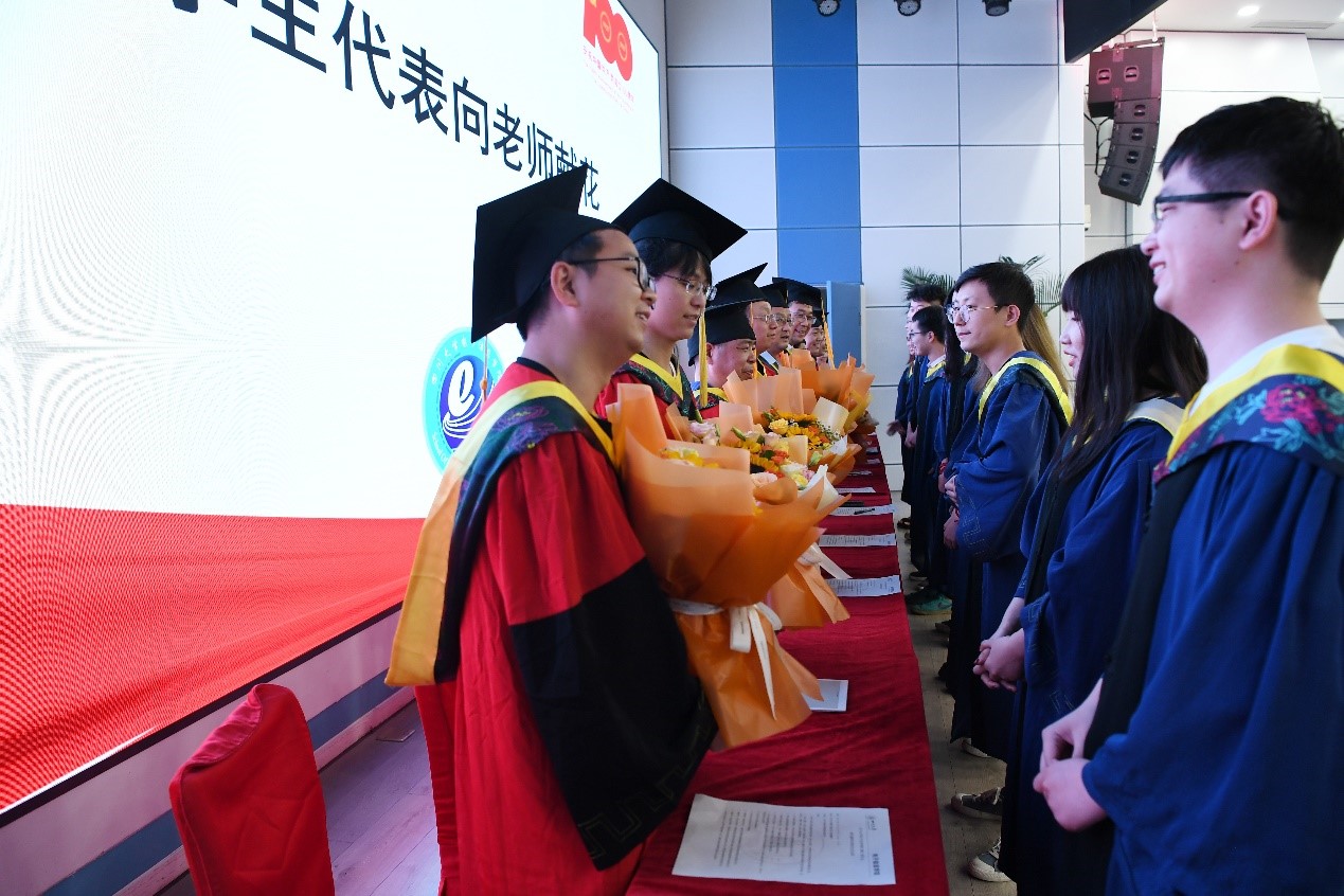 在热烈的掌声中,毕业生代表向老师献花,感谢老师们在学生求学路上的辛勤教导。