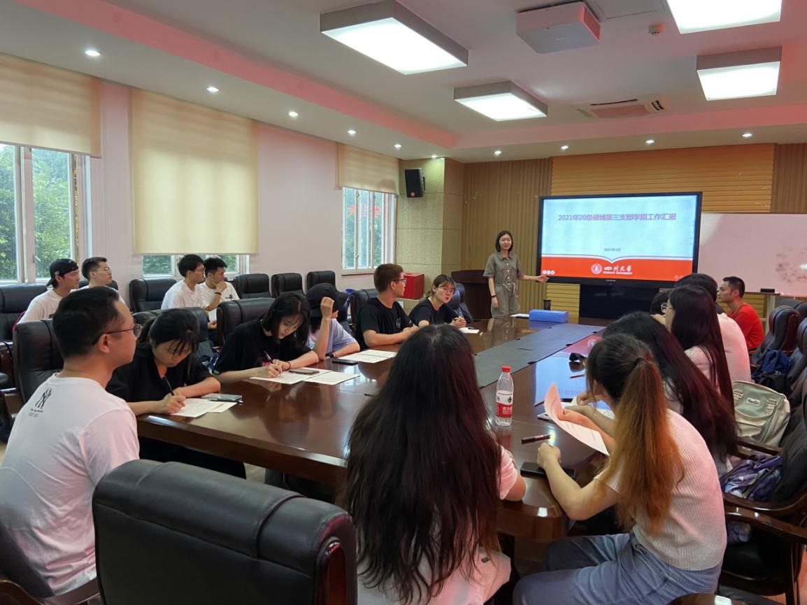 2020级硕博第三支部于2021年7月15日上午9点在基础教学楼A座303会议室召开学期支部工作总结会议。会议内容包括汇报本学期对积极分子的培养考察情况以及支部全体党员进行总结、批评与自我批评。 2020级第二党支部书记、研究生辅导员何惠老师出席本次会议,第三支部全体党员参加会议,会议由支部书记杨斯涵同志主持。