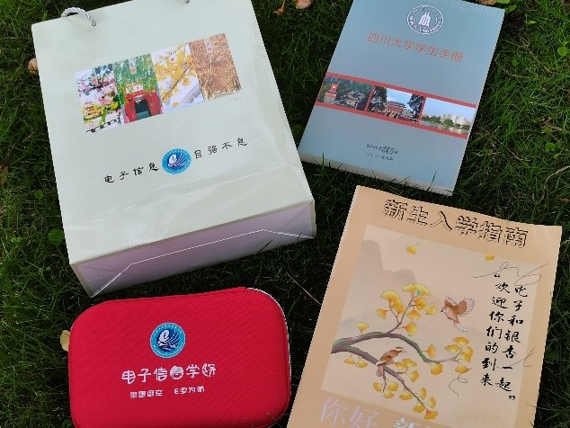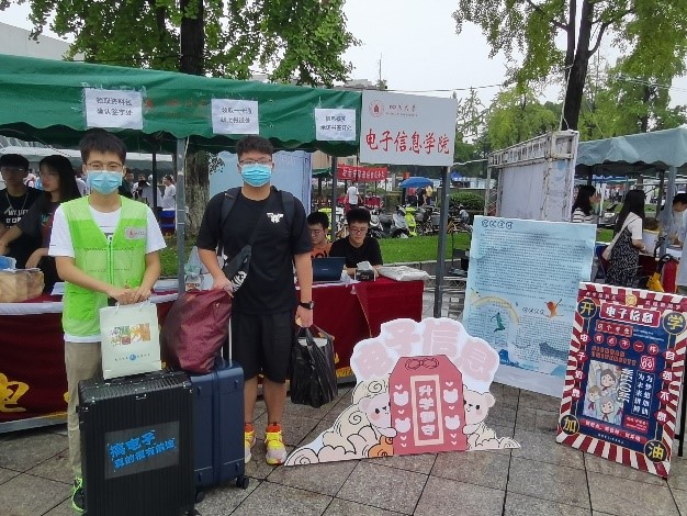 各学生组织介绍及报名表等资料以及防疫包等物品。早上八点,新生开始陆续到来。本次迎新,新生由摆渡车抵达青春广场后,便有举牌的志愿者协助其搬运行李到达学院摊位处。摊位处的同学则各司其职,井井有条地完成核对录取通知书,新生领取校园卡,新生报到签字等事项,省外的同学有专人负责带领到指定地点做核酸。我们的志愿者一边帮助新生拉取行李到寝室,一边热情地与新生进行交流,向他们介绍校园的方方面面。
