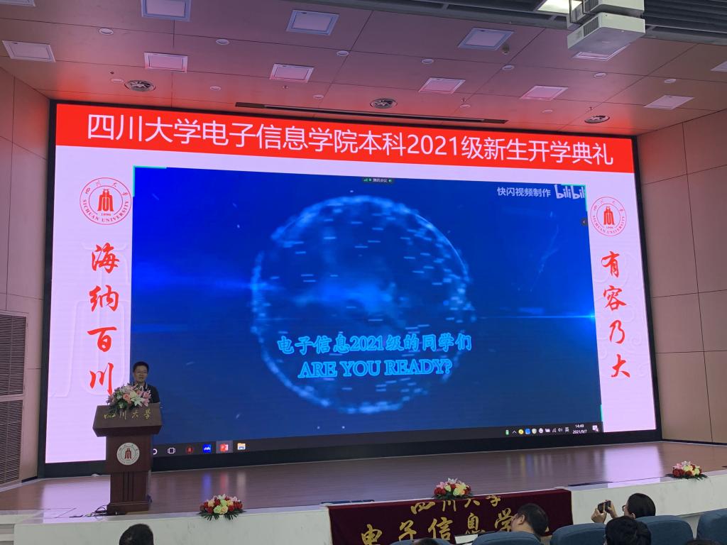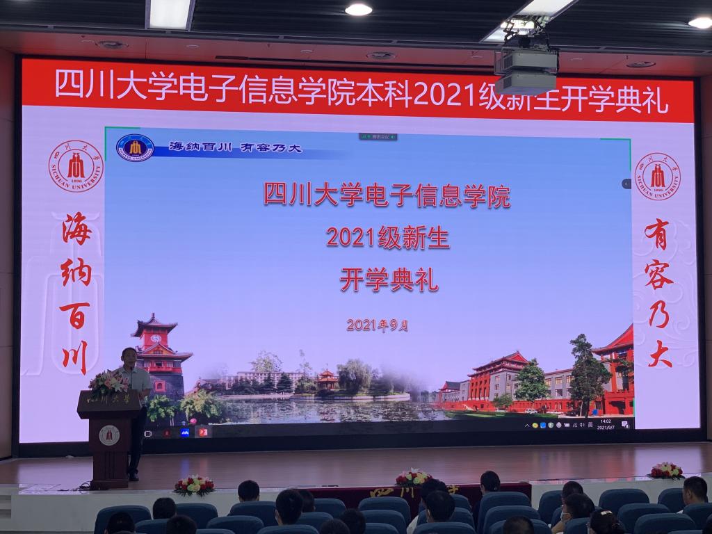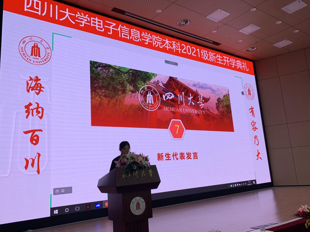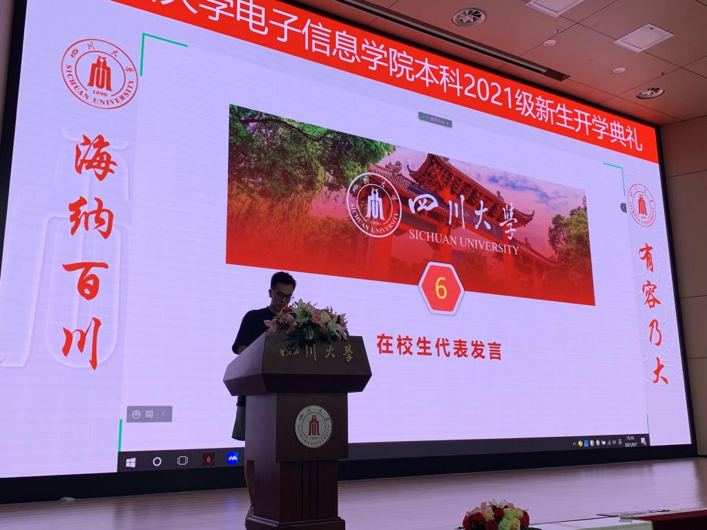 随后,教师代表博士生导师卿粼波老师进行了精彩的发言。他介绍了学院博士生取得的优秀成果,并对新生提出了殷切的期望,希望新生们能学业有成,充实地度过大学生活的每一天。在校生代表黄奕翔同学发言,鼓励新生们在学院的良好的科研平台上努力学习。新生代表王心怡同学的发言让人看到了电子信息2021级本科生的决心。她这样说到:报道前和报道时受到领导,老师与学长的关照,十分感激。如今手握川大的录取通知书站在这里,她十分期待丰富多彩的大学生活,呼吁同学们在大学里乐学善学,严于律己;但行前路,问心无愧;培养兴趣,开拓演界;致敬先贤,奋力拼搏。