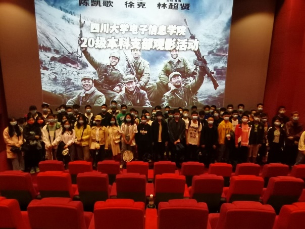 上午九点半,参加观影的同学在电影院门口有序集合并且带好口罩后进入影院。本次观影活动所播放的爱国红色影片《长津湖》以真实抗美援朝战役长津湖之战为历史背景,讲述了中国人民志愿军赴朝作战,在极寒严酷环境下,东线作战部队凭着钢铁意志和英勇无畏的战斗精神一路追击,奋勇杀敌,扭转了战场态势的故事。