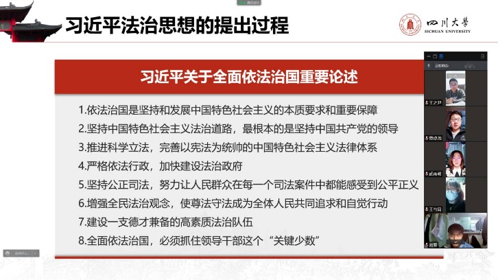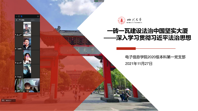 2020级本科第一党支部书记陈晓娟同志结合学习贯彻习近平总书记“七一”重要讲话精神和党史学习教育,围绕深入学习贯彻习近平法治思想,带领支部党员及入党积极分子进行了对习近平法治思想相关内容的学习。同时为做好疫情防控,统筹安排好两个校区的支部成员,故本次活动以线上形式展开。