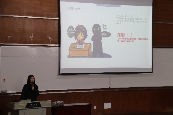 张梦蝶老师指出,学校及学院高度重视同学们的考试诚信问题。考试的目的在于让努力付出的同学得到应有的回报,并鞭策学习方面做的不够好的同学。她结合往年考试时学生违纪舞弊被严肃处理的事例,提醒同学们要以诚实守信为荣,以考试违纪为耻,一旦不诚信行为被发现,学校也将立即采取严厉的惩罚措施。同时,老师提醒同学们注意考场的相关规定细则,不要因为大意疏忽在不经意的情况下违反了考场纪律。