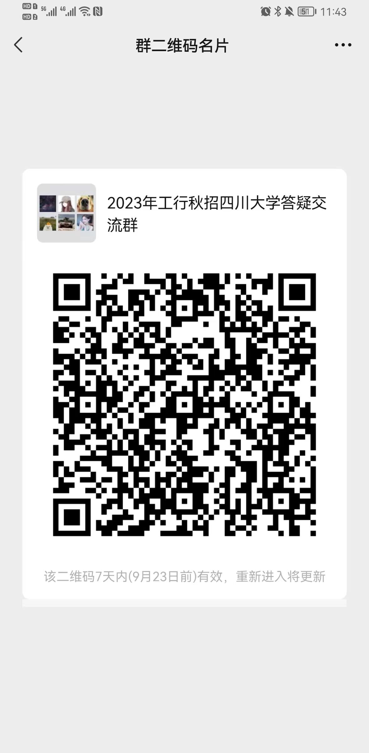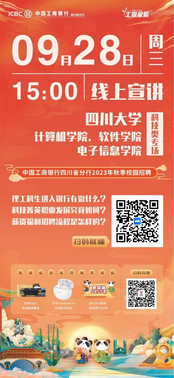四川工行2023年秋招川大工作组特为川大毕业生开启“2023年工行秋招小欧视频 答疑交流群”~群中有近三年加入四川工行的川大学长学姐作为秋招校园大使为同学们解答一切相关疑问,并交流工作心得。同时我们会在群中及时就网申、笔试、面试等信息进行发布。希望同学们踊跃入群,积极参加投递简历~抓住秋招每一次机会!