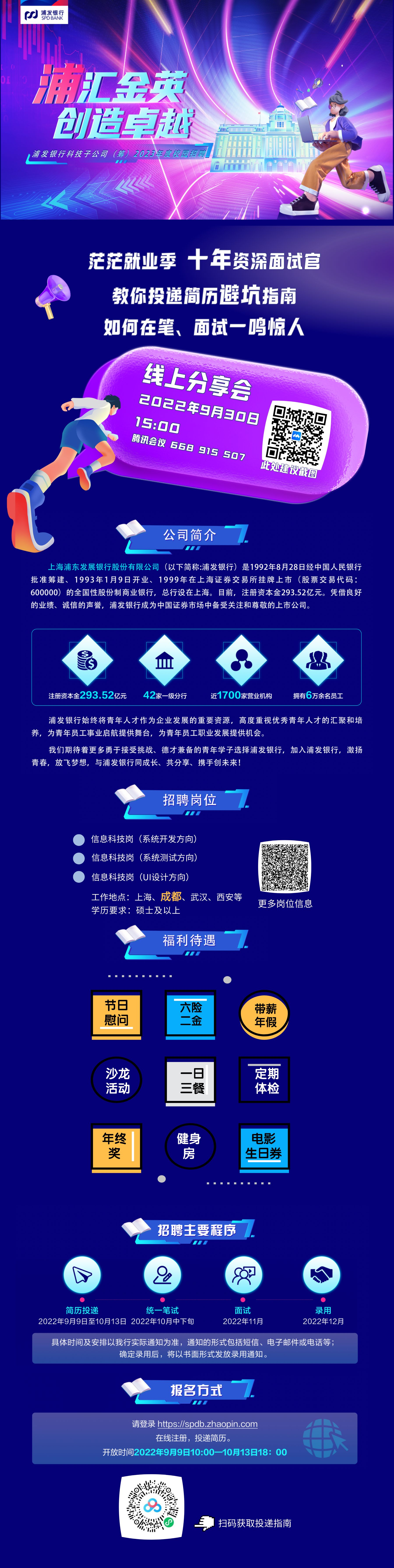 请登录 //spdb.zhaopin.com ,进行在线应聘报名,开放时间 2022 年 9 月 9 日—10 月 13 日 18:00