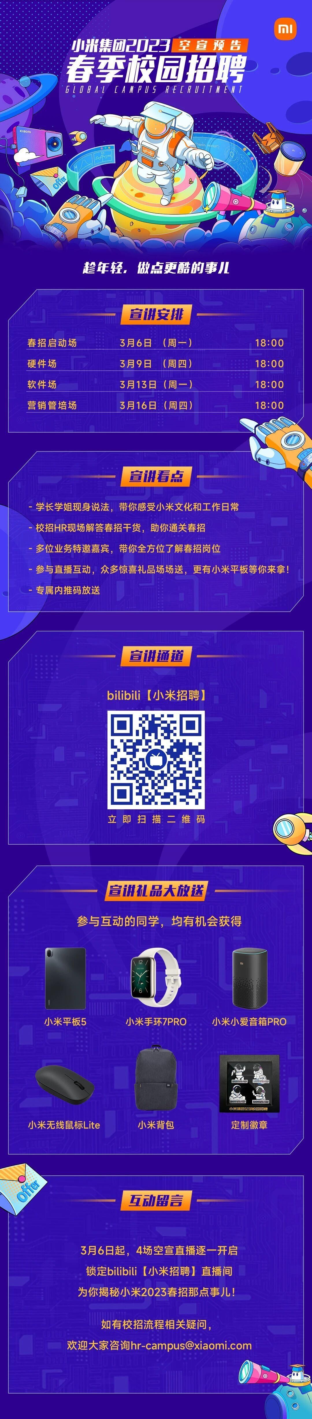 硬件场:3月9日18:00软件场:3月13日18:00营销管培场:3月16日18:00学长学姐现身说法,校招HR现场解答,多位业务嘉宾带你全方位了解岗位,参与直播互动众多惊喜礼品场场送,更有小米平板等你来拿!网申链接://hr.mi.com/campus?spread=WRFSCWJ观看地址://m.bilibili.com/space/592713320