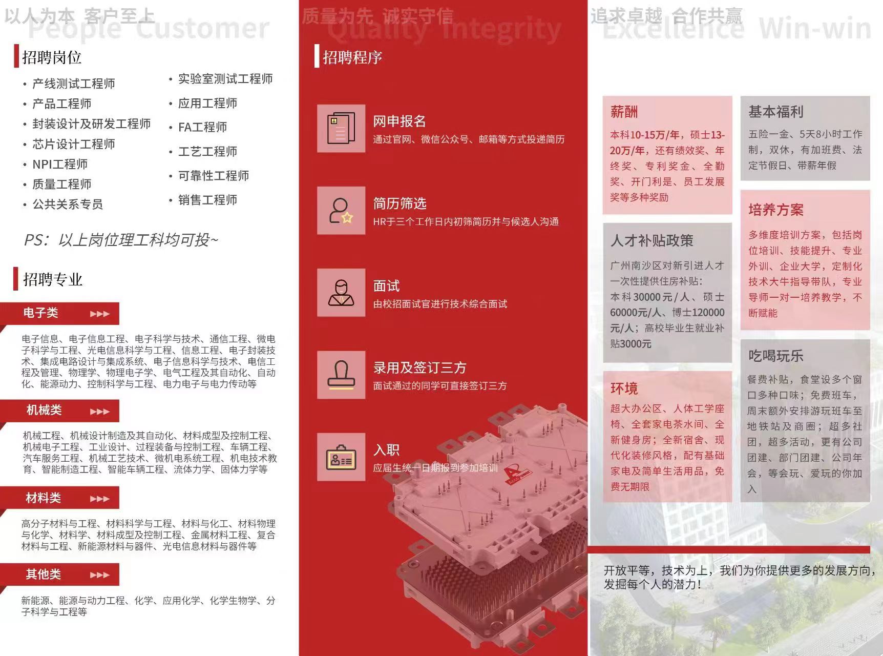为你的工作无后顾之忧:高竞争力薪酬+全新办公室+免费全新现代化装修宿舍+餐费补贴+免费班车+社团活动