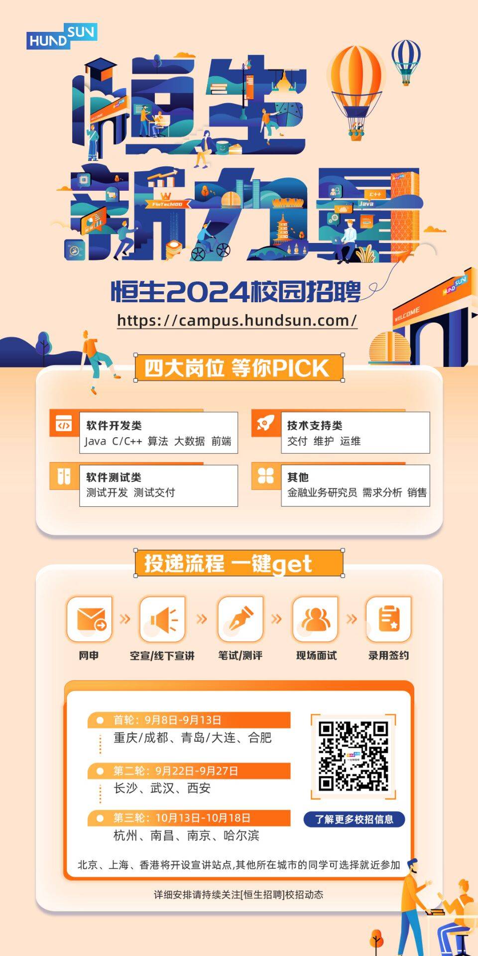 恒生电子2024年秋招启动了,700+软件开发、软件测试、技术支持等岗位等您来投递,从笔试到offer只需要一周!成都&重庆站9月8日笔试,9月12-13日初复试,有兴趣的同学抓紧投递啦,网申地址: