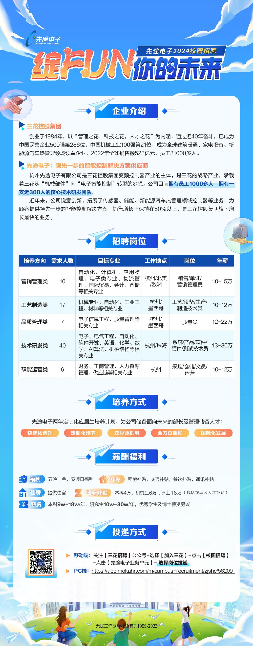三花控股集团-杭州先途电子有限公司2024秋招宣讲会-成都站正式启动 研发副总亲临现场 可指导就业方向小欧视频 (望江校区)宣讲时间:10月13日下午15点20分宣讲地点:就业指导中心305室到场惊喜:面试直通卡抽选、优先面试圈、精美伴手礼~共计100+offer,五大岗位类型,研发类13-30w,营销类10-15w,品质管理类12-22w,工艺制造类10-22w,职能运营类10-12w【关于公司】 三花控股集团创业于1984年,中国民营企业500强第215位,中国机械工业100强第21位,全球建筑暖通、家电设备、新能源汽车热管理领域领军企业,2022年全球销售额523亿元,员工31000多人。杭州先途电子有限公司是三花控股集团变频控制器产业的主体,是三花的战略产业,近年来,公司锐意创新,拓展了传感器、储能、新能源汽车热管理领域控制器等业务,为顾客提供领先一步的智能控制解决方案,是三花控股集团旗下增长最快的业务。【六大体系】 研发、营销、制造、质量、供应链、职能 【面向对象】2023年9月~2024年7月,海内外高校应届生 【工作城市】杭州or珠海,杭州为主,部分岗位有海外工作机会 简历投递方式:扫描下方海报二维码进行岗位选择特别说明:考研、考公的同学可凭录取通知书免违约金 期待和你携手 迈向先途 成就未来