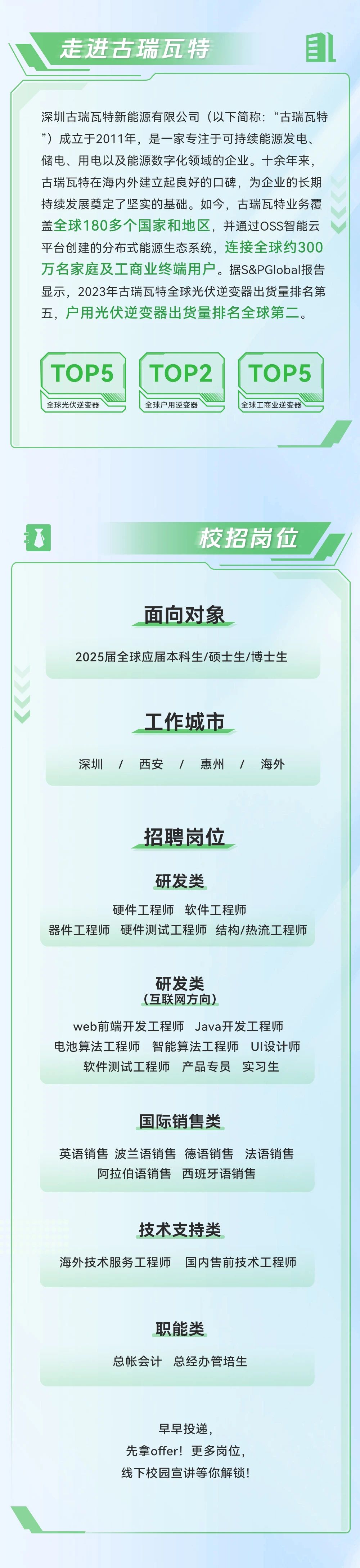 深圳古瑞瓦特新能源有限公司(以下简称:“古瑞瓦特”),是一家专注于可持续能源发电储电、用电以及能源数字化领域的企业。如今,古瑞瓦特业务覆盖全球180多个国家和地区,连接全球约300万名家庭及工商业终端用户。据S&PGlobal报告显示,2023年古瑞瓦特全球光伏逆变器出货量排名第五,户用光伏逆变器出货量排名全球第二。