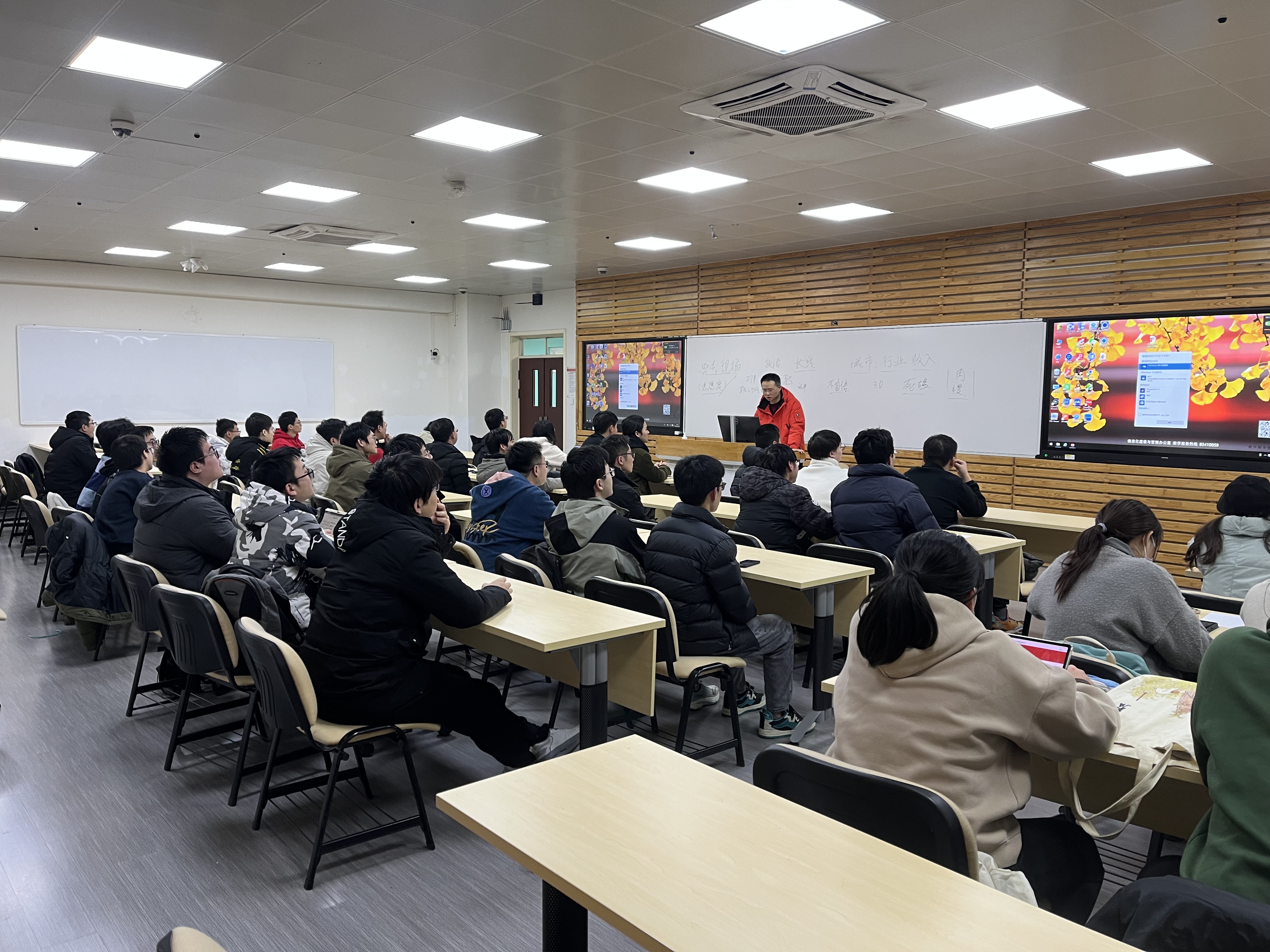 “考研后专场就业指导会”。为了让白天有实习任务的卓越班同学能够参加,本次会议特别安排在晚上,旨在帮助刚考完研的同学了解就业形势,明确就业方向,确保毕业生顺利步入职场。指导会由学生科长兼就业专职岗谢老师主讲,60余名本科应届毕业生参加。