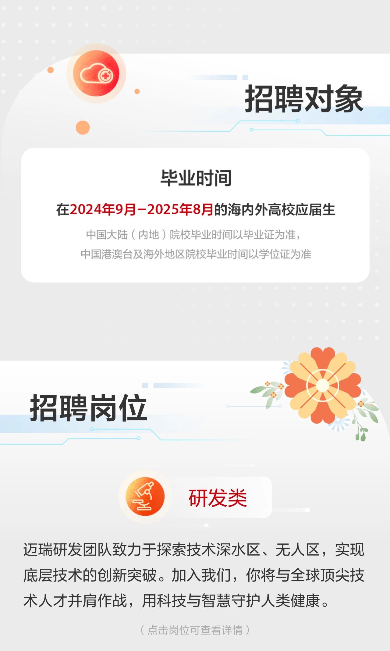 迈瑞 2025 届春招已正式开启,本次春招重点招聘研发和技术支持类岗位。同学们可通过迈瑞官网,或关注【迈瑞招聘】微信公众号进行网申。