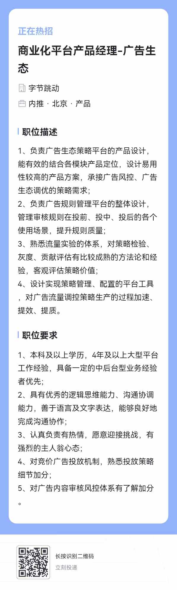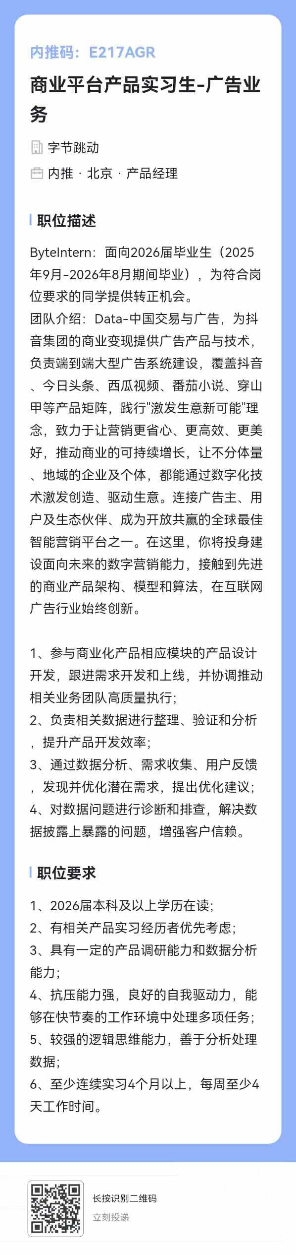 在字节的小欧视频 2018级硕士王校友(微信wy731505024)发消息,招26年毕业的校招生、实习生(可转正),以及社招商业平台产品经理,有看机会的同学或朋友欢迎推荐