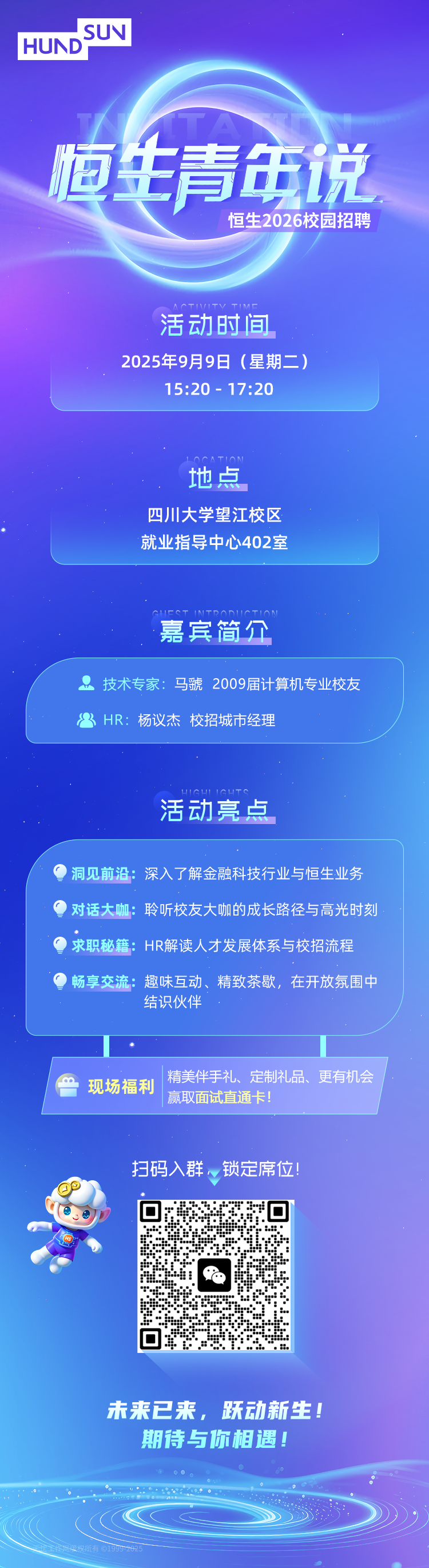恒生秋招网申已开始,有500+软件开放、测试、交付支持等岗位,同学们抓紧时间投递,地址: campus.hundsun.com。