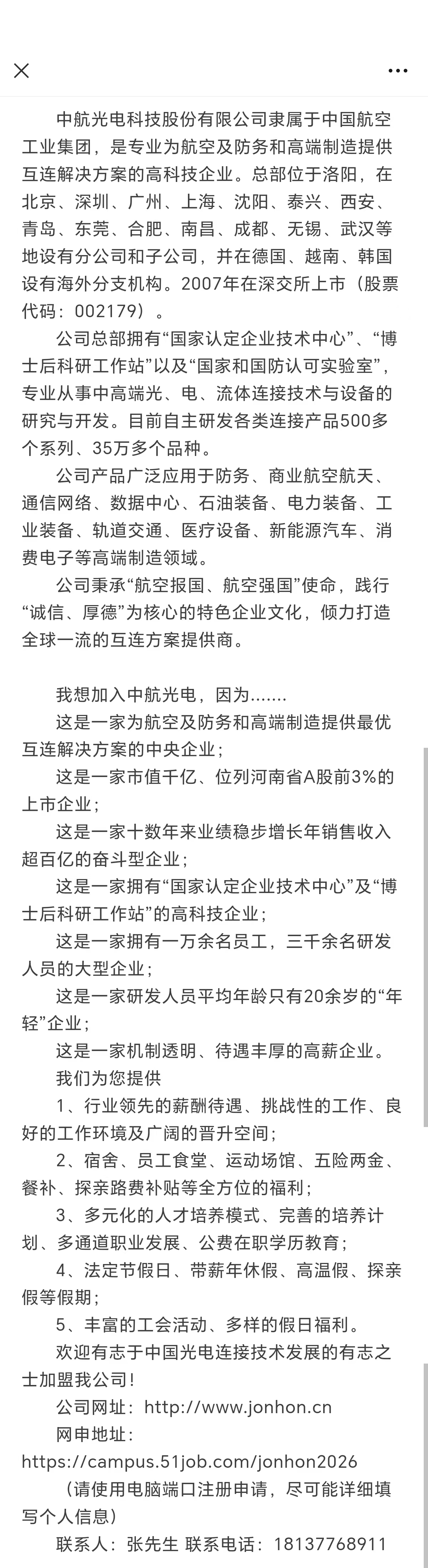 中航光电科技股份有限公司2026校园招聘