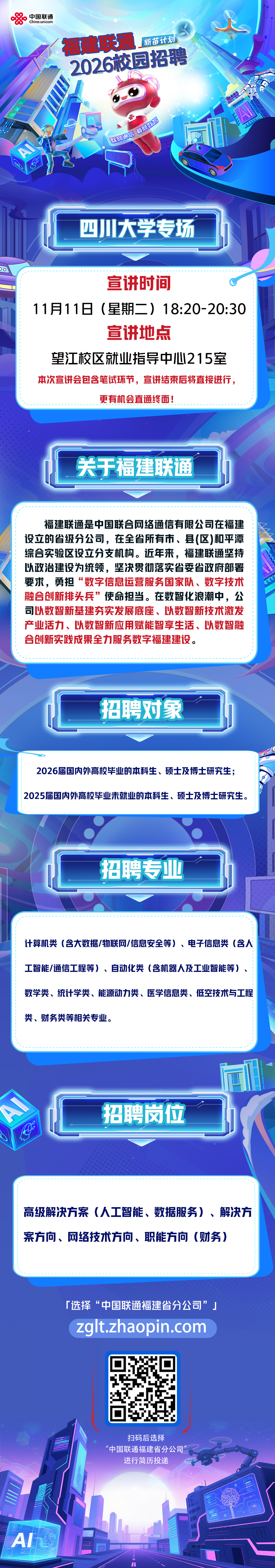 11月11日(周二)晚18:20-20:20,就业指导中心215室,福建联通校园招聘(含笔试)期待您的参与。