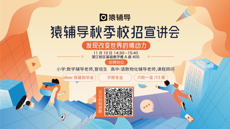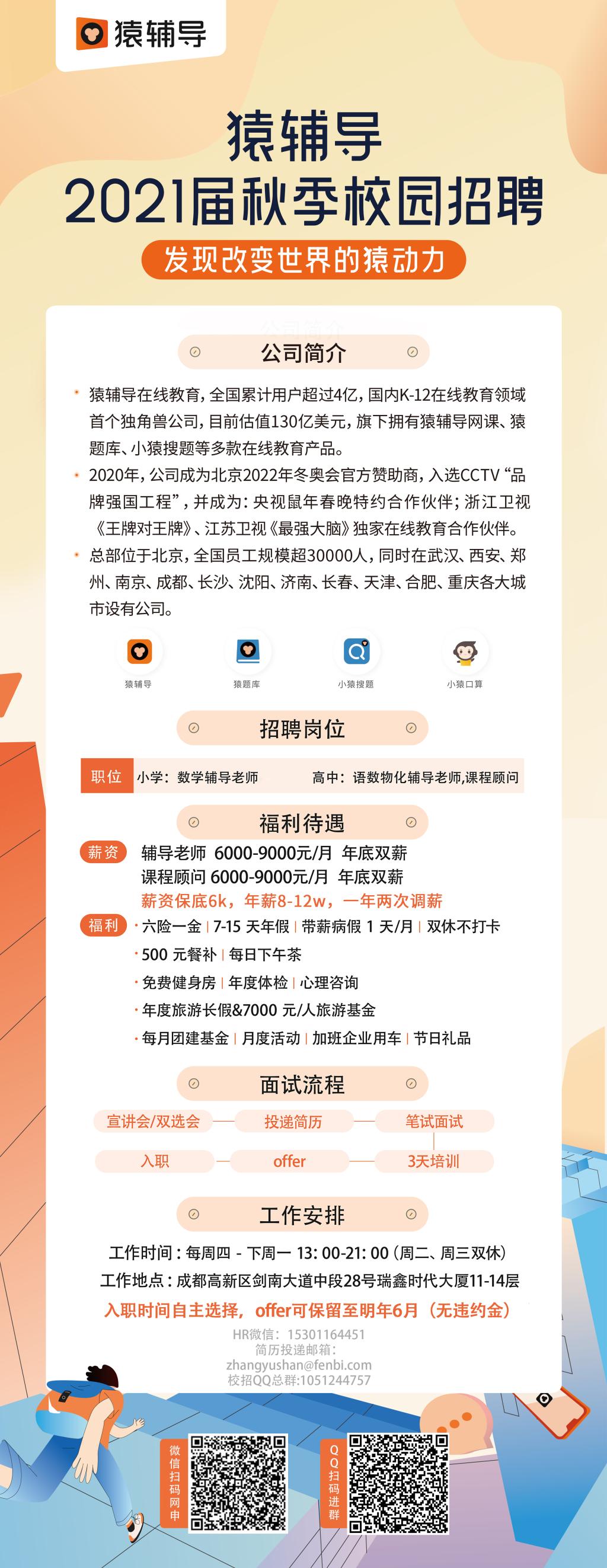 【猿辅导21届秋招小欧视频 站】CCTV强国品牌,《最强大脑》合作伙伴,平台大,薪资够,福利多!【薪资福利】️上午不上班,弹性不打卡️每日下午茶,免费健身房️年度出国游,每年7000元旅游基金️入职标配新电脑、新iPad、新手机️每月双休+带薪假,全年7-15天年假【平台】CCTV强国品牌,估值超过155亿的独角兽企业,年轻化,扁平化的互联网氛围(员工平均年龄23岁)。宣讲现场抽奖,礼盒送不停!所有到场同学都送小猿伴手礼一份哦!