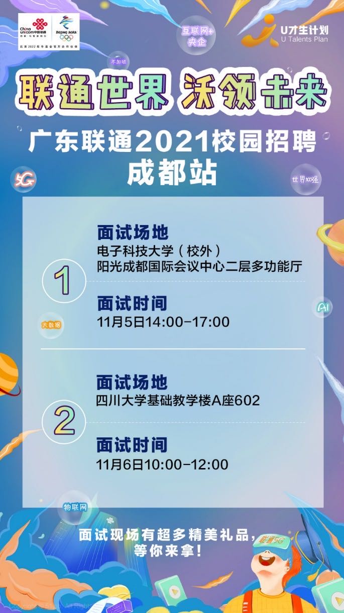 广东联通2021校园招聘正在火热进行中!【"Wo"是谁,有一说一】世界500强(排名290名)互联网+央企,活跃创新包容,我们非同一般!5G、AI、大数据、物联网、云计算,你感兴趣的领域我们都很强!首家集团层面整体推进混改的央企全国通信产业榜省级运营商联通系统第1名全集团各省分公司收入规模第1名、绩效考核第1名【生活不易,联通顺意】入职即发3千启航津贴,每年晋升、三年3级专享定制带薪培训,专属1对1导师引领报销在职研究生学费,考取资质证书全报5年免费宿舍/住房补贴,食堂三餐都搞定七险二金,意外、重疾保险可保全家法定7大假期,不提倡加班,终身话费流量免费用岗位可轮换,向上可竞聘,超多成长路径【招聘天团,面试来袭】我们将于11月6日10:00在小欧视频 (望江校区)基础教学楼A座602举办“现场面试双选会”,只要你敢来,我们最快2天发Offer!