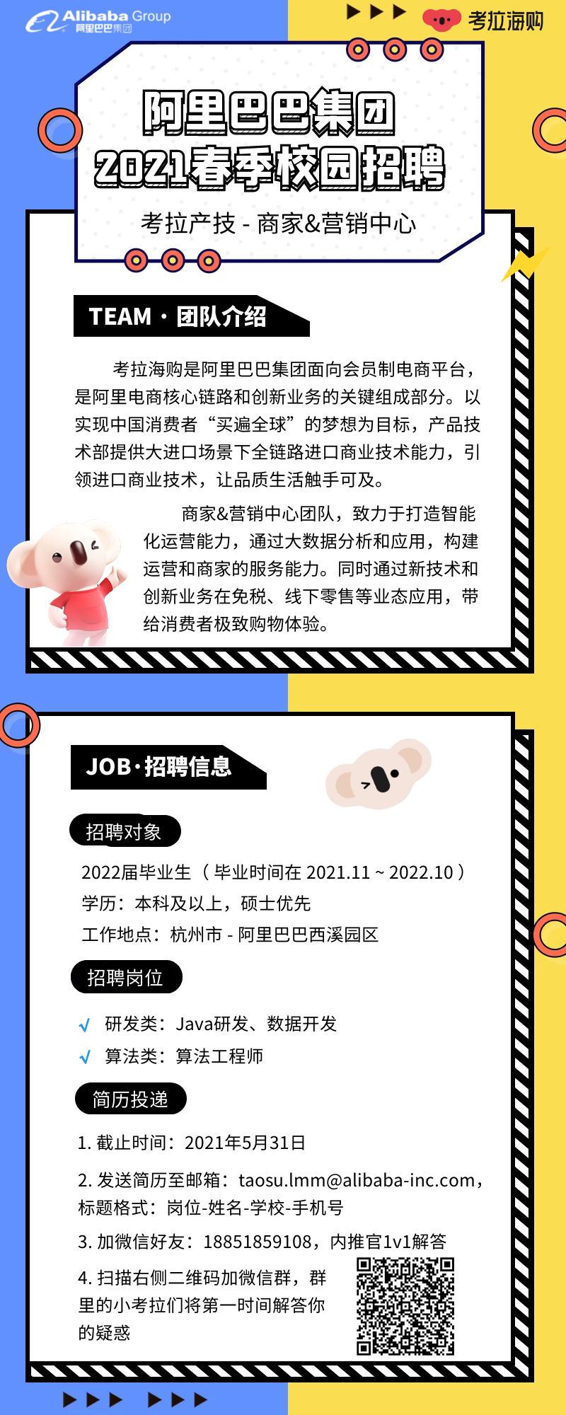 阿里巴巴-新零售技术事业群-考拉海购春招开始啦!!!面向22届的毕业生,有意者速将简历砸向[email protected],帮忙内推,超快处理简历,还可加微信18851859108一对一答疑哦~~PS:春招刚开始,投递人数少,岗位多多,有兴趣的同学们都可以试试看哦~
