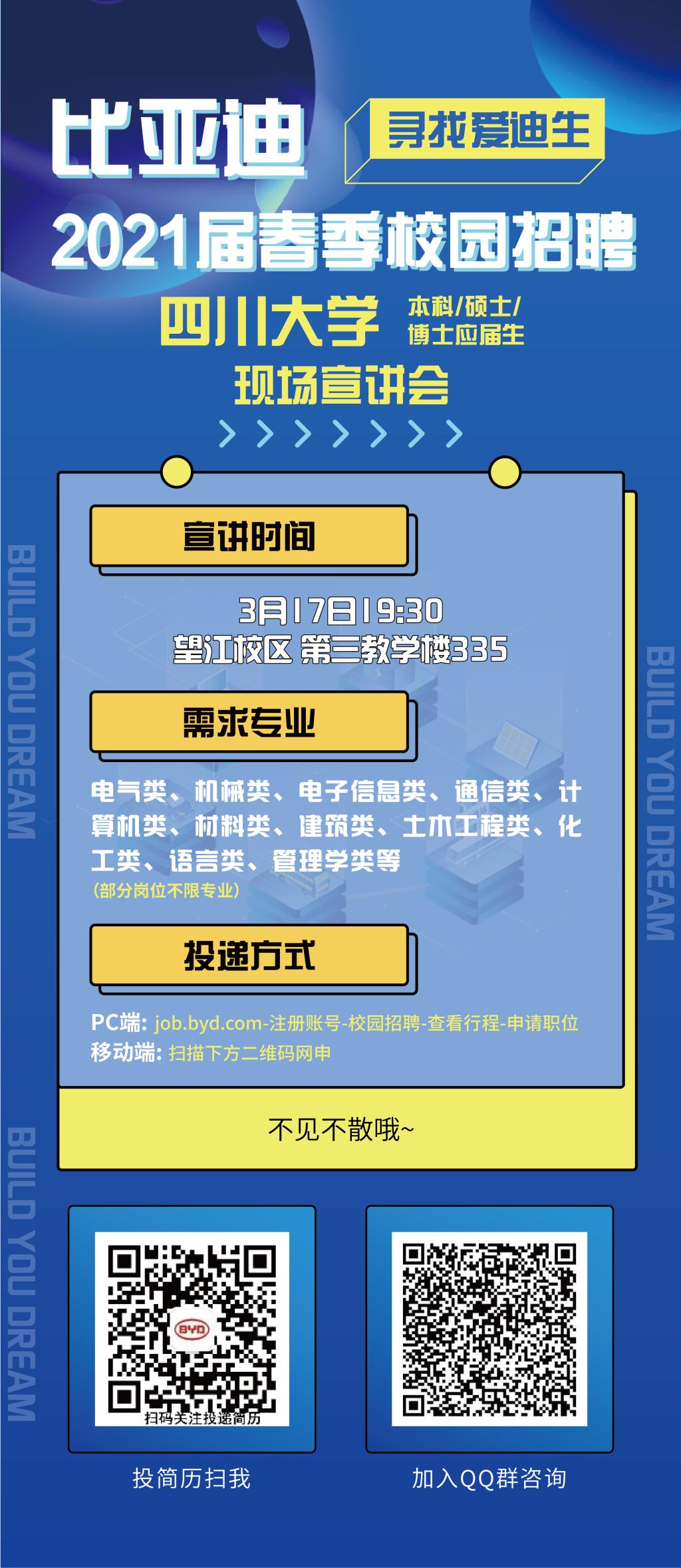 自3月起,空中宣讲会和线下宣讲行程将第一时间发布在 “比亚迪招聘”公众号、比亚迪招聘官网,各高校就业网站/公众号发布