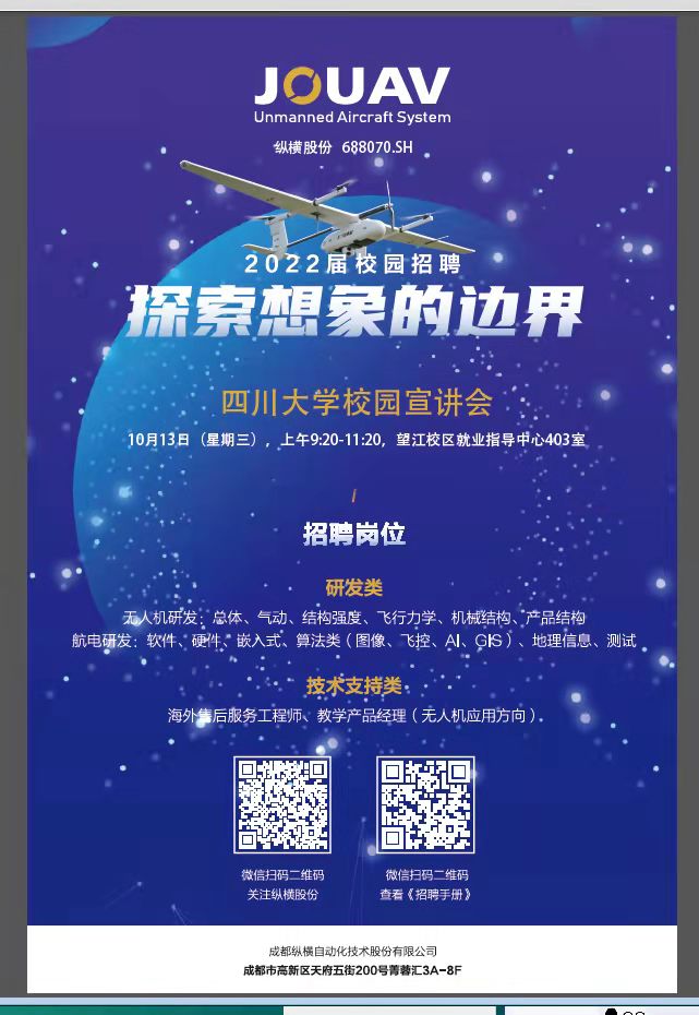 成都纵横自动化技术股份有限公司(纵横股份,688070.SH),成立于2010年,系高新技术企业,成都市无人机产业协会会长单位,四川省优秀民营企业。公司专注于工业无人机相关产品的研发、生产、销售及服务,致力于为客户提供智能化、标准化、工具化的工业无人机系统,是国内规模领先、最具市场竞争力的工业无人机企业之一。总部位于成都市高新区。