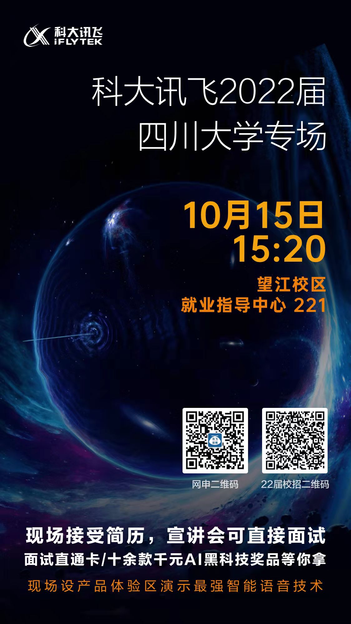 科大讯飞川大宣讲,我们会在现场布置人工智能产品体验区,还有十几份千元AI电子产品作为奖品,欢迎同学们来参加!