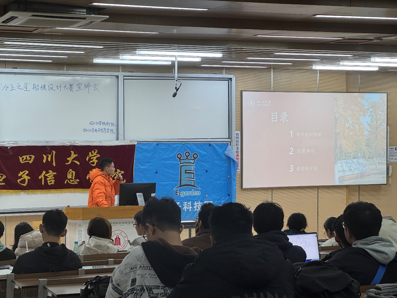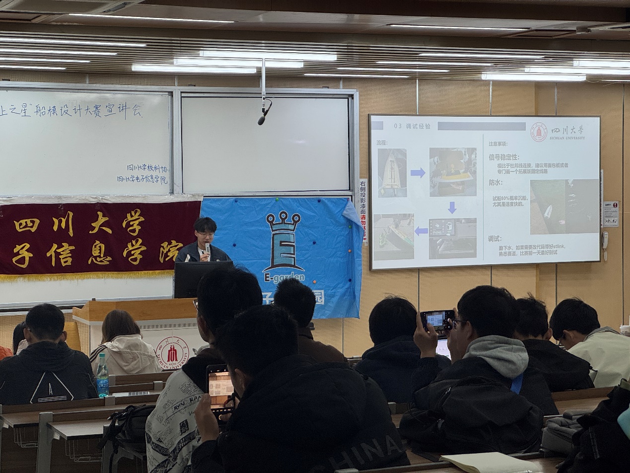 本次宣讲会的顺利举行,极大的鼓舞了参赛同学的决心,同时为暂无头绪的同学们提供了道路指引与技术指导。希望看到同学们为比赛而努力奋斗的身影,期待着新一届的船模大赛如期举行并展现出更加优秀独特的电子风采!