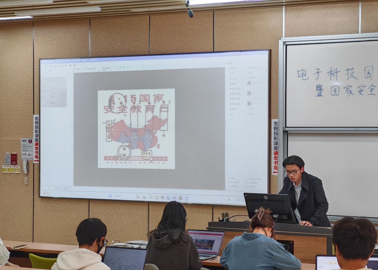 三方共建,与国家安全紧密相连。活动特别强调了保密与国家安全相辅相成的关系,保密工作是维护国家安全的重要手段。最后,对于 “如何维护国家安全”,我们需要警惕可疑人员未经批准的内部调查,留意境外传媒的煽动造谣,对军事、保密单位周边可疑人员及时报告等。讲解完毕后,便是马昌全同学为大家进行PCB授课,详细地讲解了如何在国家安全日的内容基础上使用EDA绘制电路板,设计出既具有一定功能,又体现国家安全日主题内容的电路板,并由在场的技术部同学为大家答疑解惑。最后,大家通过投票选出制作精良的PCB电路板,并为参与设计电路板的同学颁发小礼品。