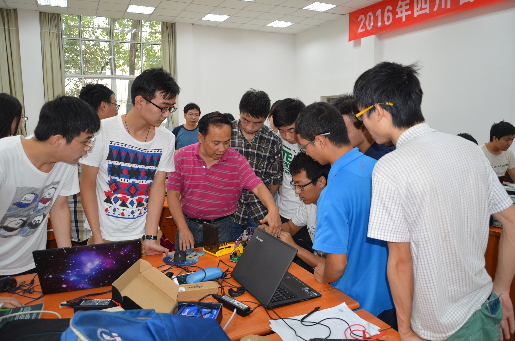 2016年省电子设计竞赛为期七天的赛前培训正式开始,参加本次赛前培训的有学院党委蒋斌书记、副院长周新志教授、徐家品教授、王正勇副教授、华伟副教授、植涌老师、夏文龙老师、孟庆党老师、刘俐老师、陈晓娟老师以及李运国老师。