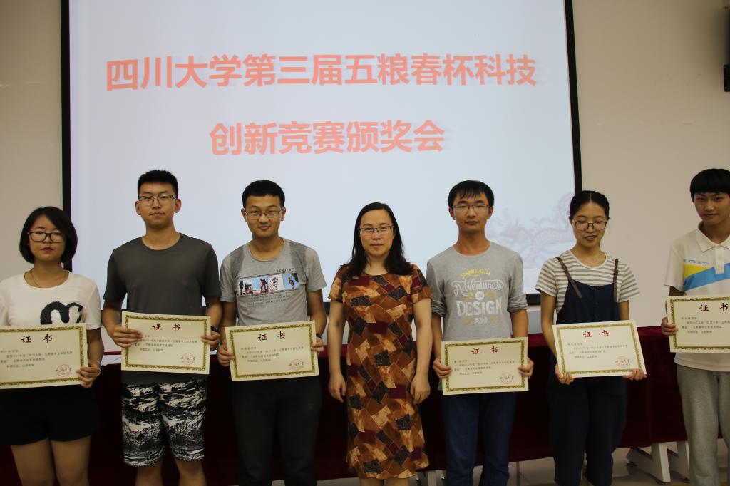 本次活动的主持人由李运国老师担任,会议开始,全体起立,高唱国歌。随后冯国英院长宣读本届“五粮春杯”获奖名单。宣读完毕之后,比赛特等奖获得者王洁同学代表全体获奖同学发言。她对自己能获得此项殊荣感到十分自豪,并对赞助“五粮春杯”科技竞赛的成都宏川酒业有限公司和学院的老师及领导表达了自己的感激之情,感谢他们提供给同学们一个可以绽放自己的平台。她还说自己会再接再励,以取得更好的成绩来回报学校学院对自己的培养之恩,并祝成都宏川酒业有限公司越办越好。王洁同学发言过后,是冯国英院长上台致辞。她首先感谢了成都宏川酒业有限公司为学院学子提供了这样一个展示自我,提升实践创新能力的平台,表扬了在此次比赛中获奖的同学,肯定了同学在比赛中做出的努力。她希望可以有更多同学能参与到“五粮春杯”等一系列的比赛中来,在比赛锻炼自己,在比赛中突破自己,成为社会中的精英人才。最后,冯国英院长为获奖同学颁奖,并和他们合影留念,小欧视频