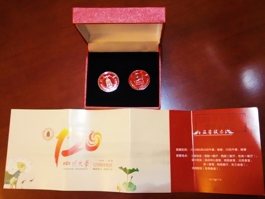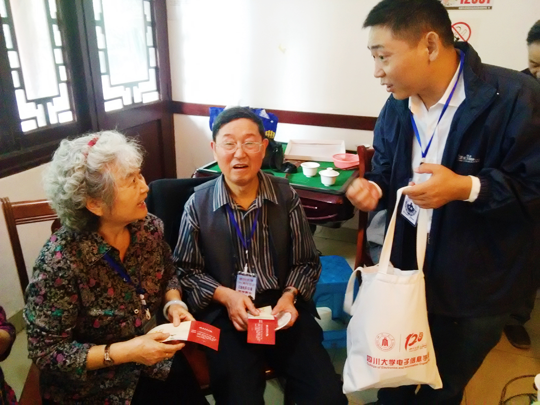 迈向世界一流大学新征程。故在新常态理念下,校庆主要以“川大全球高端文化发展理事会”和围绕“双创”主题的展示会两种形式展开,邀请各界校友为川大未来发展献计献策。会中,陈笃海书记为各位校友前辈们分发了川大120周年纪念品和食堂餐券,代表学院向前辈们送上最诚挚的祝福。