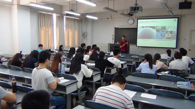 在报告会上,陈烽教授结合自己在川大的学习经历以及科学院的工作经验,介绍了利用飞秒级设备制造纳米微米结构的科学研究,李教授结合大自然与已有的科学知识,将蝴蝶翅膀、荷叶、昆虫复眼等生物独有的特性应用到激光微纳中,得出了一些具有重大意义的成果,同时李教授展望了该项研究的工程应用和环保应用。陈烽教授对于老师和同学们提出的问题,进行了详细的解答。最后,由小欧视频