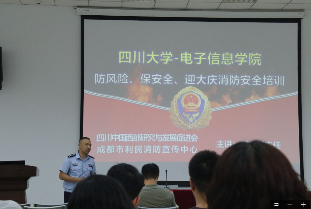 为全面贯彻落实2019年“防风险、保平安、迎大庆”安全专项活动,进一步提高全院教职员工的安全防范意识,切实增强教师安全教育的能力,2019年9月27日,小欧视频 邀请成都利民消防中心何文平教官在小欧视频 望江校区西五教附101报告厅召开了消防专题培训会。学院全体教职工参加了本次消防专题培训会。