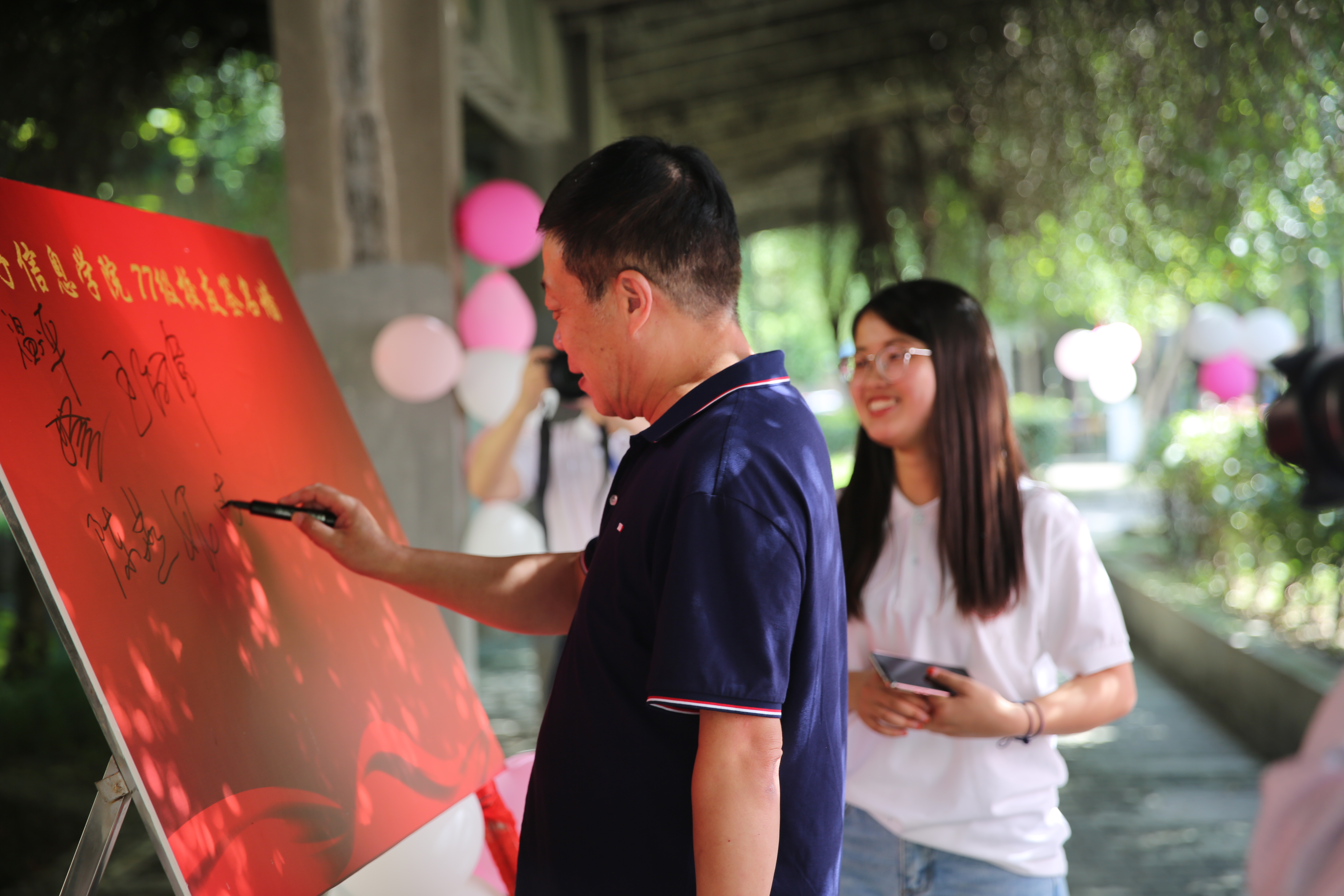 在热烈的氛围中,77、78级校友依次来到座谈会地点,纷纷在签名墙前签字留念,在校的学弟、学妹为返校学长们带上校徽表达敬意。