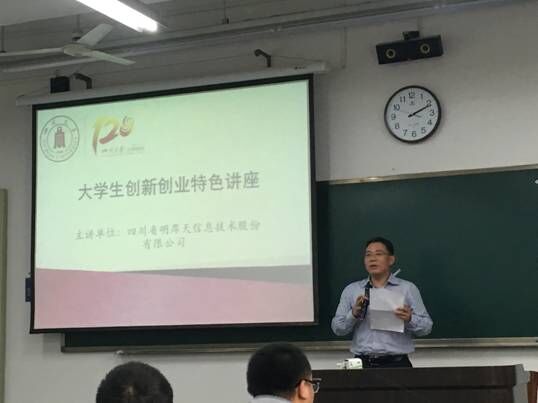 校庆系列讲座之——大学生创新创业特色讲座在望江校区二教201顺利召开。副院长周新志教授,明厚天副总经理李明先生,中国合伙人主席陈宣兵先生,成都创之道科技有限公司董事长王非先生出席讲座。